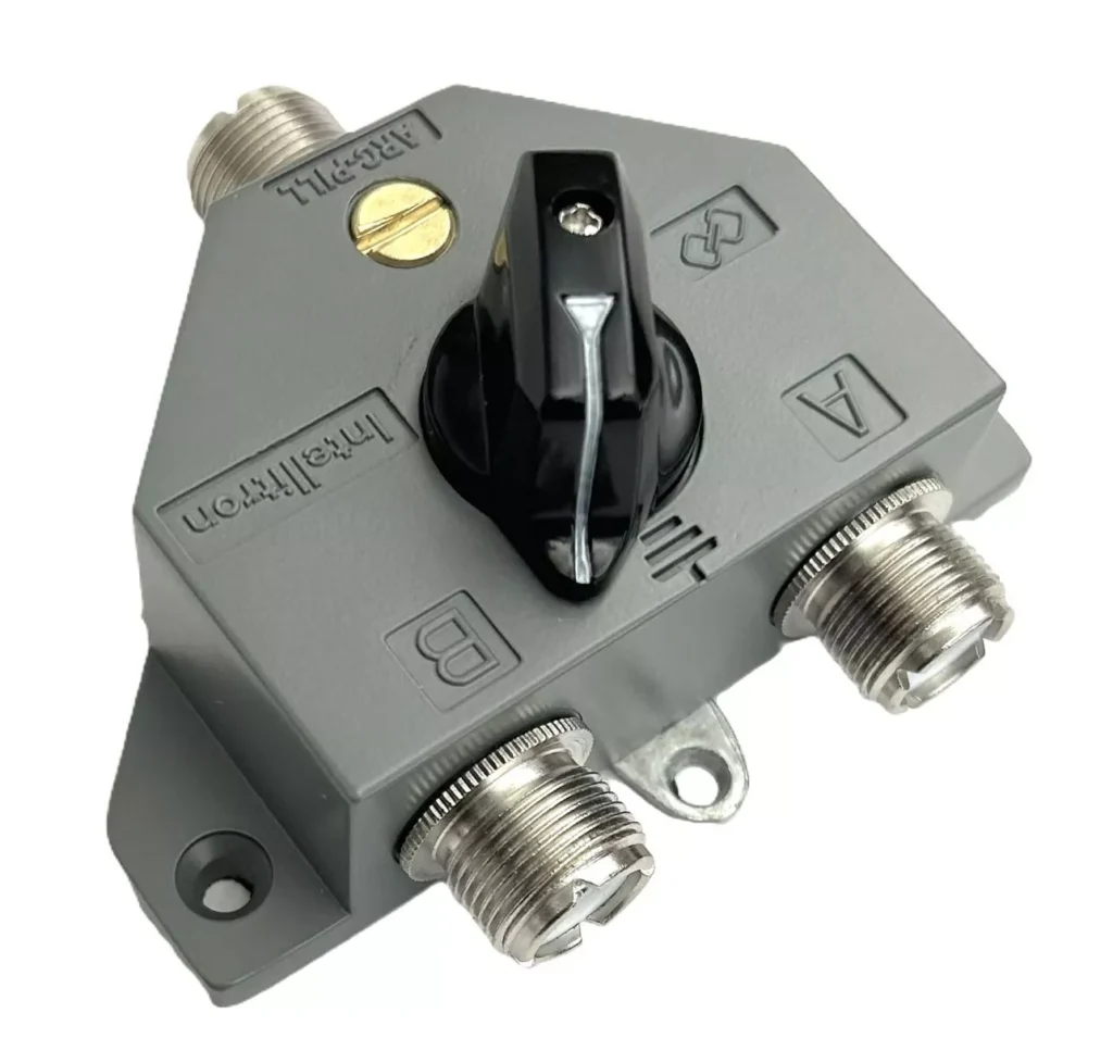 This versatile switch operates across a broad HF/VHF/UHF frequency range, featuring two active positions, “A” and “B”. When one port is selected, the unselected port is automatically grounded, adding a layer of protection. For enhanced safety, a center-off position is also available, which grounds both “A” and “B” ports while disconnecting the input (radio) entirely.