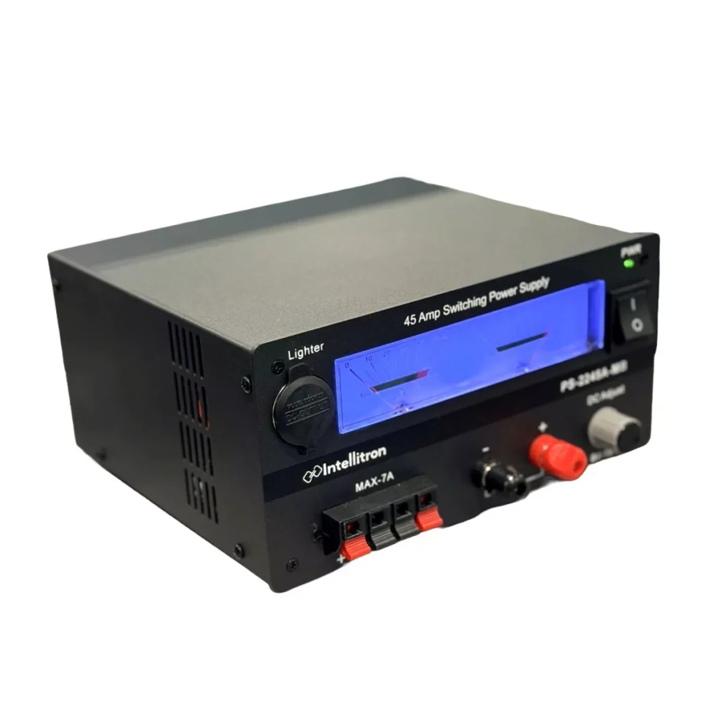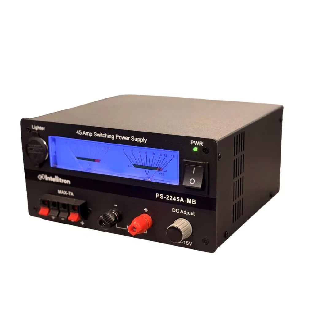 The Intellitron PS-2245A-MB delivers the kind of performance serious operators rely on. It offers a powerful Current Range of 45-Amp Surge (up to 5 minutes) and an impressive 40 Amps Continuous Duty, easily handling the high-peak currents of powerful HF/VHF/UHF rigs. The supply maintains a stable Adjustable Voltage Range from 9 VDC to 15 VDC, allowing for precision tuning to your equipment’s specific requirements.